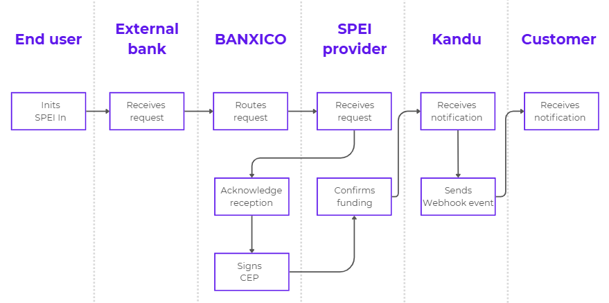As** SPEI-In** funding is non-reliant on any endpoint but rather the user initiating the funding of a **CLABE **given to him through the User Enrollment Process there is no endpoint that gives service to this feature, rather, it's reliant on a Webhook that the customer needs to expose in order to credit the funds received to the **CLABE **in question. Please see the Weebook documentation.